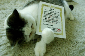 2003年8月、1歳で猫の保護ボランティアから引き取る。好奇心旺盛でフレンドリー。毎日の出迎えを欠かさない律義者。パンやお菓子類の匂いが大好きだが、日々の食事は療法食。11年と2ヶ月一緒に暮らした。